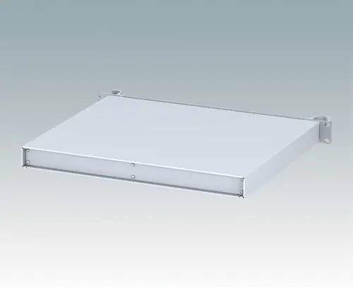 Modern aluminum 19" rack case with an anodised front panel and two ergonomic front panel handles. The case body consists of a solid wrap around top cover with removable base and rear panel. The base is pre-punched for fitting PCB mounting pillars or the accessory internal mounting plate. All parts are provided with M4 earth studs for electrical continuity.