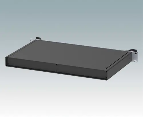Modern aluminium 19" rack case with an anodised front panel and two ergonomic front panel handles. The case body consists of two side panels with removable top, base and rear panel. The base is pre-punched for fitting PCB mounting pillars or the accessory internal mounting plate. All parts are provided with M4 earth studs for electrical continuity.