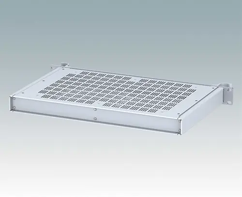Modern ventilated aluminum 19" rack case with an anodized front panel and two ergonomic front panel handles. The case body consists of two side panels with removable top, base and rear panel. The base is pre-punched for fitting PCB mounting pillars or the accessory internal mounting plate. All parts are provided with M4 earth studs for electrical continuity.