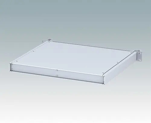 Modern aluminum 19" rack case with an anodized front panel and two ergonomic front panel handles. The case body consists of two side panels with removable top, base and rear panel. The base is pre-punched for fitting PCB mounting pillars or the accessory internal mounting plate. All parts are provided with M4 earth studs for electrical continuity.