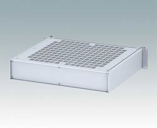 Modern ventilated aluminum 19" rack case with an anodized front panel and two ergonomic front panel handles. The case body consists of two side panels with removable top, base and rear panel. The base is pre-punched for fitting PCB mounting pillars or the accessory internal mounting plate. All parts are provided with M4 earth studs for electrical continuity.