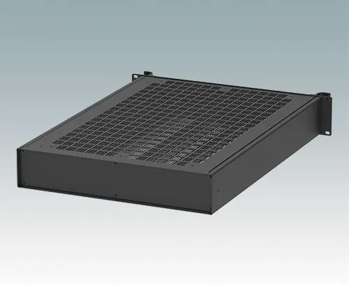 Modern ventilated aluminum 19" rack case, 24" deep, with a painted black front panel and two ergonomic front panel handles. The case body consists of two side panels with removable top, base and rear panel. The base is pre-punched for fitting PCB mounting pillars or the accessory internal mounting plate. All parts are provided with M4 earth studs for electrical continuity.