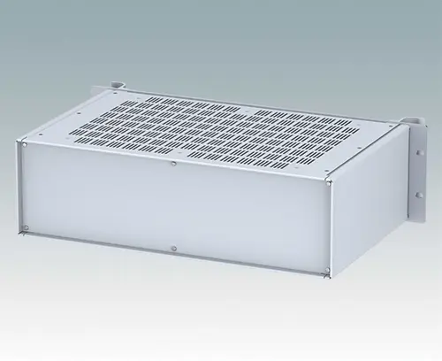 Modern ventilated aluminum 19" rack case with an anodized front panel and two ergonomic front panel handles. The case body consists of two side panels with removable top, base and rear panel. The base is pre-punched for fitting PCB mounting pillars or the accessory internal mounting plate. All parts are provided with M4 earth studs for electrical continuity.