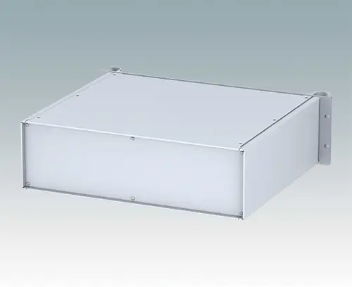 Modern aluminum 19" rack case with an anodized front panel and two ergonomic front panel handles. The case body consists of two side panels with removable top, base and rear panel. The base is pre-punched for fitting PCB mounting pillars or the accessory internal mounting plate. All parts are provided with M4 earth studs for electrical continuity.