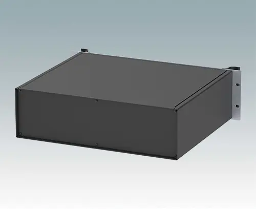 Modern aluminum 19" rack case with an anodized front panel and two ergonomic front panel handles. The case body consists of two side panels with removable top, base and rear panel. The base is pre-punched for fitting PCB mounting pillars or the accessory internal mounting plate. All parts are provided with M4 earth studs for electrical continuity.