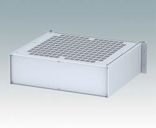 Modern ventilated aluminum 19" rack case with an anodized front panel and two ergonomic front panel handles. The case body consists of two side panels with removable top, base and rear panel. The base is pre-punched for fitting PCB mounting pillars or the accessory internal mounting plate. All parts are provided with M4 earth studs for electrical continuity.