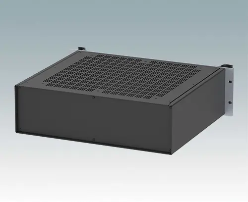 Modern ventilated aluminum 19" rack case with an anodized front panel and two ergonomic front panel handles. The case body consists of two side panels with removable top, base and rear panel. The base is pre-punched for fitting PCB mounting pillars or the accessory internal mounting plate. All parts are provided with M4 earth studs for electrical continuity.