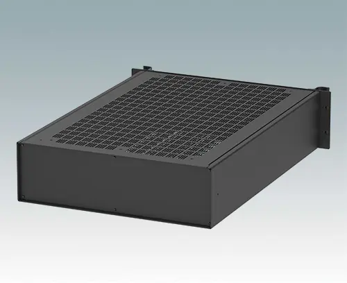 Modern ventilated aluminum 19" rack case, 24" deep, with a painted black front panel and two ergonomic front panel handles. The case body consists of two side panels with removable top, base and rear panel. The base is pre-punched for fitting PCB mounting pillars or the accessory internal mounting plate. All parts are provided with M4 earth studs for electrical continuity.