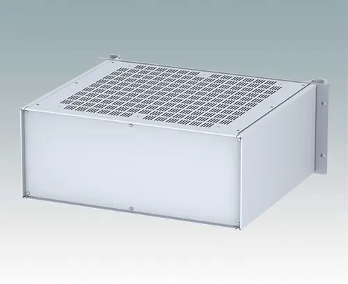 Modern ventilated aluminum 19" rack case with an anodized front panel and two ergonomic front panel handles. The case body consists of two side panels with removable top, base and rear panel. The base is pre-punched for fitting PCB mounting pillars or the accessory internal mounting plate. All parts are provided with M4 earth studs for electrical continuity.