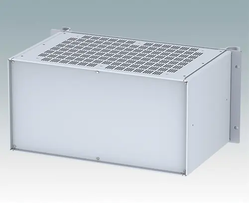 Modern aluminum 19" rack case with an anodized front panel and two ergonomic front panel handles. The case body consists of two side panels with removable top, base and rear panel. The base is pre-punched for fitting PCB mounting pillars or the accessory internal mounting plate. All parts are provided with M4 earth studs for electrical continuity.