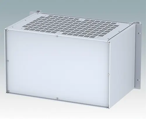 Modern ventilated aluminum 19" rack case with an anodized front panel and two ergonomic front panel handles. The case body consists of two side panels with removable top, base and rear panel. The base is pre-punched for fitting PCB mounting pillars or the accessory internal mounting plate. All parts are provided with M4 earth studs for electrical continuity.