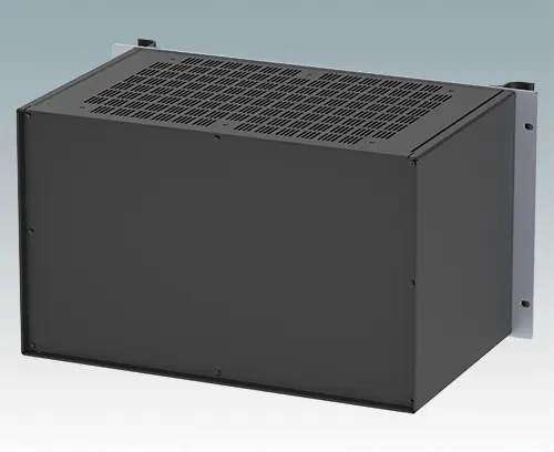 Modern ventilated aluminum 19" rack case with an anodized front panel and two ergonomic front panel handles. The case body consists of two side panels with removable top, base and rear panel. The base is pre-punched for fitting PCB mounting pillars or the accessory internal mounting plate. All parts are provided with M4 earth studs for electrical continuity.