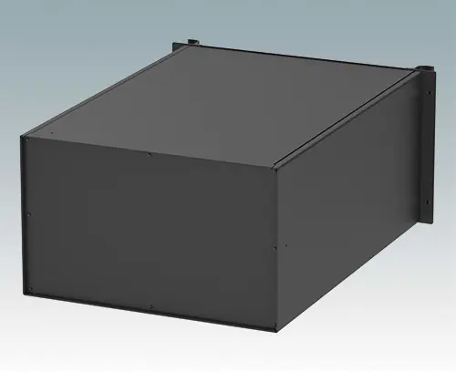 Modern aluminum 19" rack case, 24" deep, with a painted black front panel and two ergonomic front panel handles. The case body consists of two side panels with removable top, base and rear panel. The base is pre-punched for fitting PCB mounting pillars or the accessory internal mounting plate. All parts are provided with M4 earth studs for electrical continuity.
