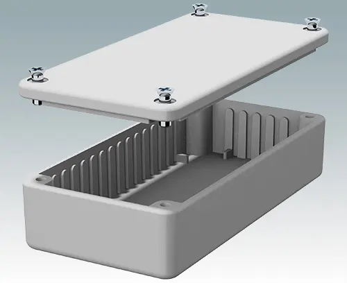 Highly durable and shock resistant diecast enclosure. Vertical guides and stand-offs provided in the base for locating PCBs and assemblies. IP 65 (NEMA 4) sealing gasket and external mounting brackets available as accessories.