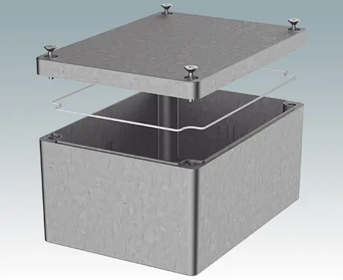 Highly durable and shock resistant diecast enclosure sealed to IP 65 (NEMA 4). Secure tongue and groove assembly. Screw bosses provided in the base for fixing PCBs and assemblies.