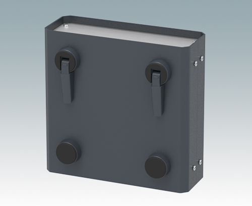 Stylish and modern case feet with tilt legs for canting. Universal design for fitting to any type of plastic or metal enclosure. Four part assembly with foot body, push-in anti-skid TPE pad, tilt leg with 120° rotation and self-tapping screw. Max. enclosure wall thickness 0.12" (3 mm) with screws provided (alternative screws can be supplied for larger wall thicknesses). Simply drill three holes per foot in the enclosure panel - see drawings for drilling details.