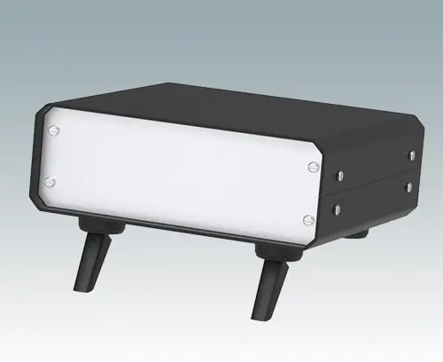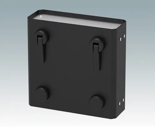 Stylish and modern case feet with tilt legs for canting. Universal design for fitting to any type of plastic or metal enclosure. Four part assembly with foot body, push-in anti-skid TPE pad, tilt leg with 120° rotation and self-tapping screw. Max. enclosure wall thickness 0.12" (3 mm) with screws provided (alternative screws can be supplied for larger wall thicknesses). Simply drill three holes per foot in the enclosure panel - see drawings for drilling details.