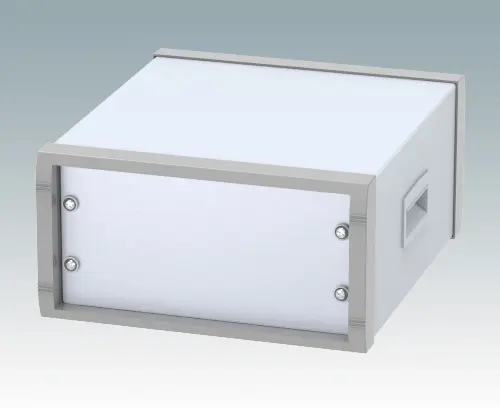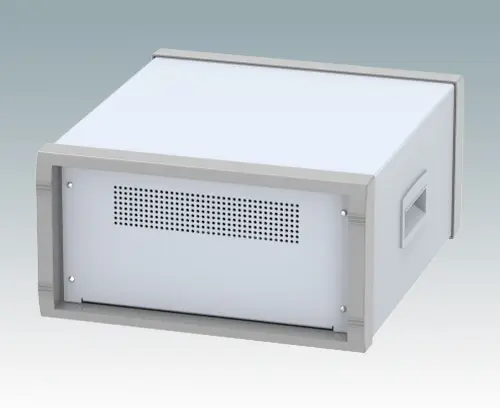 Stylish 10.5" instrument case for mounting 3U subracks, chassis or front panels. Desktop version with ABS sides handles. Robust design with two die cast front bezels and fabricated case body. The base panel and rear panel are ventilated. Internal chassis runners support the equipment. Supplied with pre-fitted with ABS tilt feet.