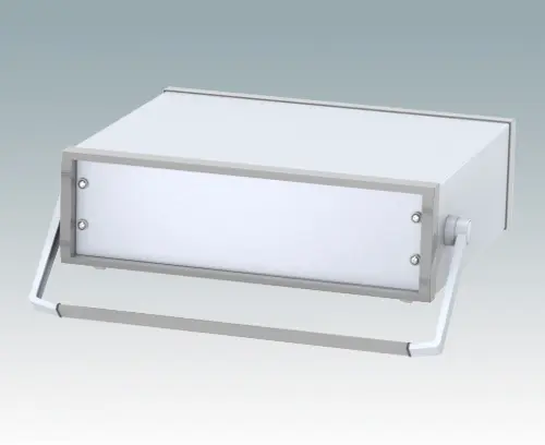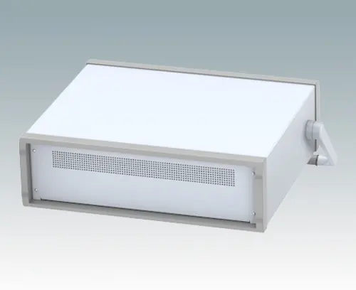Stylish 19" instrument case for mounting 3U subracks, chassis or front panels. Portable version with metal handle/bail arm. Robust design with two die cast front bezels and fabricated case body. The base panel and rear panel are ventilated. Internal chassis runners support the equipment. Supplied with pre-fitted with ABS tilt feet.