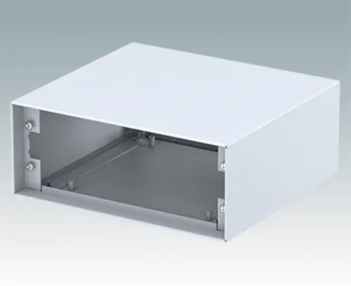 Modern instrument case for small desktop and portable electronics. Folded aluminum top and base covers are assembled by hidden fixing screws on the underside. Front and rear apertures are recessed by 0.31" and 0.55" at the opposite ends. Order front and rear panels separately.
