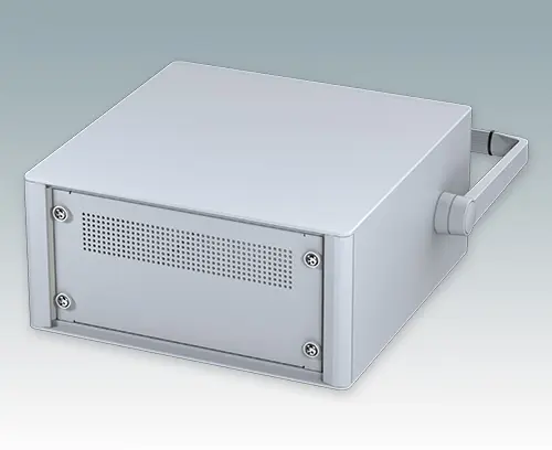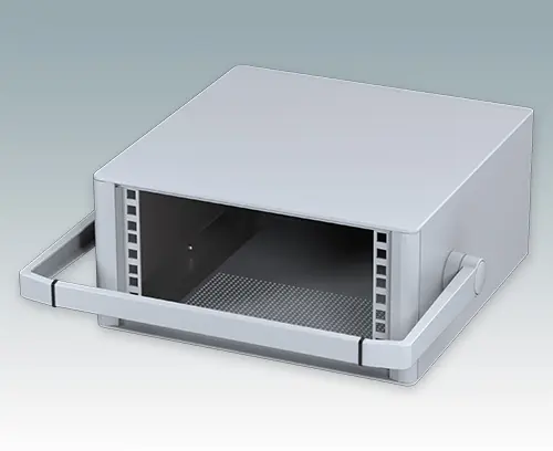 Modern and highly attractive 10.5" instrument enclosure for mounting 3U subracks (42HP), chassis or front panels. Conforms to DIN 41494 & IEC 297. Stylish front and rear bezels are fitted to the aluminum case body. Clip-on trims at the front and rear hide the assembly screws giving a very professional appearance. All case panels fitted with M4 threaded pillars for earth connection. The case is supplied with a rear panel, a bail arm and four ABS non-slip feet. Ventilation slots are provided in the base and rear panel. Internal chassis runners support the 10.5" equipment.