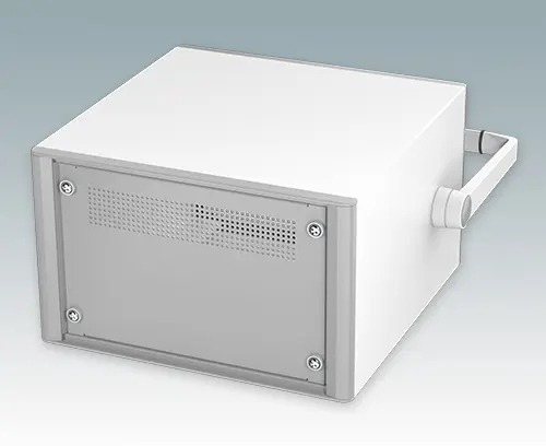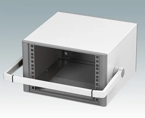 Modern and highly attractive 10.5" instrument enclosure for mounting 4U subracks (42HP), chassis or front panels. Conforms to DIN 41494 & IEC 297. Stylish front and rear bezels are fitted to the aluminum case body. Clip-on trims at the front and rear hide the assembly screws giving a very professional appearance. All case panels fitted with M4 threaded pillars for earth connection. The case is supplied with a rear panel, a bail arm and four ABS non-slip feet. Ventilation slots are provided in the base and rear panel. Internal chassis runners support the 10.5" equipment.