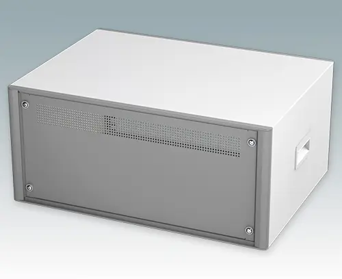 The case is supplied with a rear panel, two ABS side handles and four ABS non-slip feet. Ventilation slots are provided in the base and rear panel. Internal chassis runners support the 19" equipment.