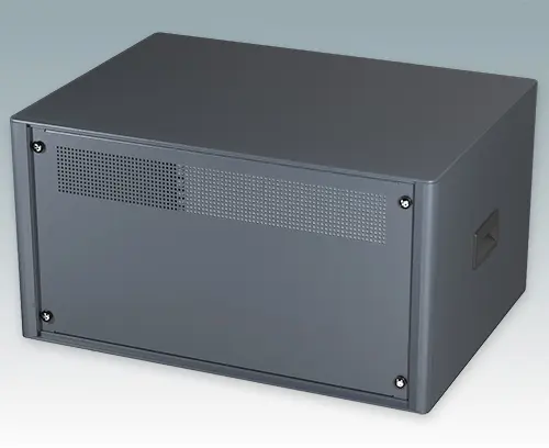 The case is supplied with a rear panel, two ABS side handles and four ABS non-slip feet. Ventilation slots are provided in the base and rear panel. Internal chassis runners support the 19" equipment.
