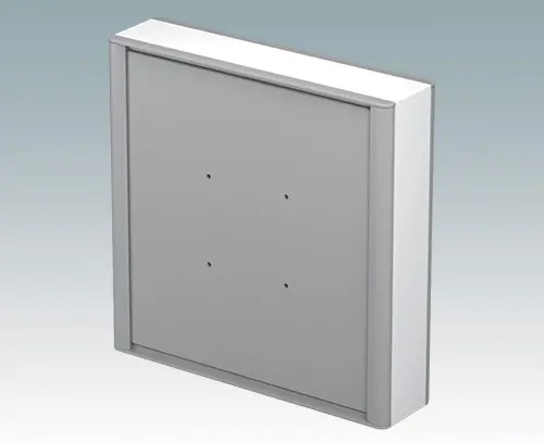 Modern and highly attractive aluminum instrument enclosure for fitting displays, touch screens and HMI electronics. VESA MIS-D 100 mounting points are provided on the rear panel for fitting the unit to a standard VESA control arm or mounting bracket. Stylish front and rear diecast bezels are fitted to the case body. Clip-on trims at the front and rear hide all the assembly screws, giving a very professional appearance. The base panel on the underside provides space for cable entry. M3 PCB mounting pillars are provided inside. The assembly extrusions also have M3 mounting holes and guide rails for fitting internal plates. M4 earth studs are fitted to all parts; some studs can also be used with retaining straps to hold the front/rear panels during maintenance. Front panels are sold separately. Accessories include a wall mounting kit, a pole mounting bracket and an internal mounting plate.