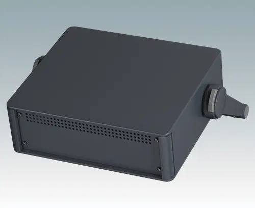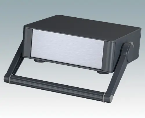 Modern and highly attractive instrument enclosure with handle/bail arm for desktop and portable electronics. Stylish front and rear bezels are fitted to the aluminum case body. Clip-on trims at the front and rear hide the assembly screws and front panel screws, giving a very professional appearance. The handle can be indexed at 30° increments. The pre-assembled internal chassis is supplied with four M3 PCB mounting pillars fitted to the base panel. The internal chassis can also be fitted with 3 slide-in PCBs using the accessory snap-in guide M6490020 (order 2 guides per PCB).