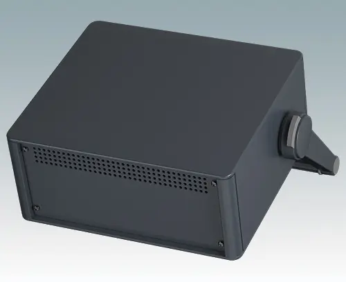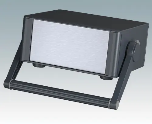 Modern and highly attractive instrument enclosure with handle/bail arm for desktop and portable electronics. Stylish front and rear bezels are fitted to the aluminum case body. Clip-on trims at the front and rear hide the assembly screws and front panel screws, giving a very professional appearance. The handle can be indexed at 30° increments. The pre-assembled internal chassis is supplied with four M3 PCB mounting pillars fitted to the base panel. The internal chassis can also be fitted with 5 slide-in PCBs using the accessory snap-in guide M6490020 (order 2 guides per PCB).