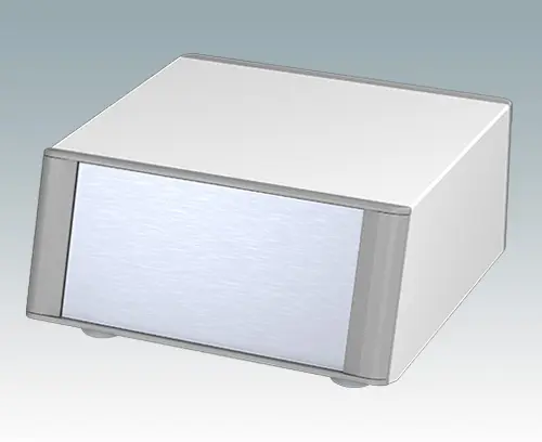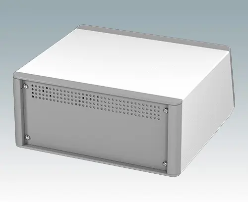 Modern and highly attractive instrument enclosure with sloping front bezel for desktop or portable electronics. Stylish front and rear bezels are fitted to the aluminum case body. Clip-on trims at the front and rear hide the assembly screws and front panel screws, giving a very professional appearance. The pre-assembled internal chassis is supplied with four M3 PCB mounting pillars fitted in the base. The internal chassis can also be fitted with 5 slide-in PCBs using the accessory snap-in guide M6490020 (order 2 guides per PCB). The case is supplied with a rear panel and four ABS feet with tilt legs. Ventilation slots are provided in the base and rear panel. Order front panels separately.