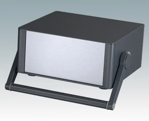 Modern and highly attractive instrument enclosure with handle/bail arm for desktop and portable electronics. Stylish front and rear bezels are fitted to the aluminum case body. Clip-on trims at the front and rear hide the assembly screws and front panel screws, giving a very professional appearance. The handle can be indexed at 30° increments. The pre-assembled internal chassis is supplied with four M3 PCB mounting pillars fitted to the base panel. The internal chassis can also be fitted with 7 slide-in PCBs using the accessory snap-in guide M6490010 (order 4 guides per PCB).