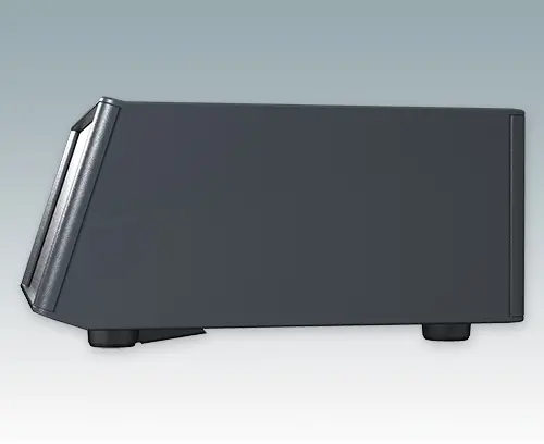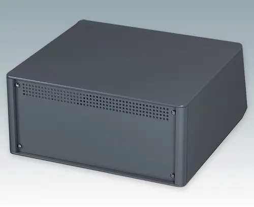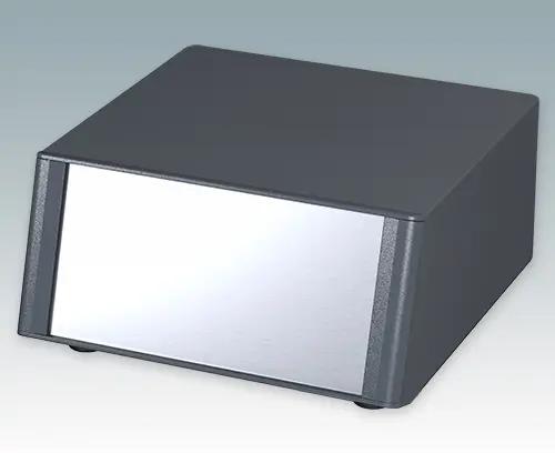 Modern and highly attractive instrument enclosure with sloping front bezel for desktop or portable electronics. Stylish front and rear bezels are fitted to the aluminum case body. Clip-on trims at the front and rear hide the assembly screws and front panel screws, giving a very professional appearance. The pre-assembled internal chassis is supplied with four M3 PCB mounting pillars fitted in the base. The internal chassis can also be fitted with 7 slide-in PCBs using the accessory snap-in guide M6490010 (order 4 guides per PCB). The case is supplied with a rear panel and four ABS feet with tilt legs. Ventilation slots are provided in the base and rear panel. Order front panels separately.