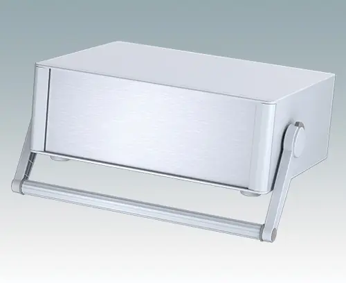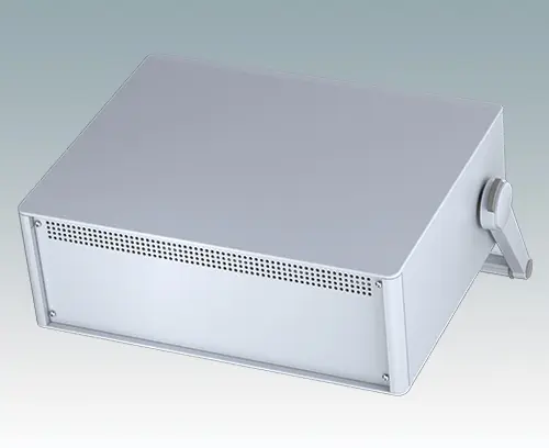 Modern and highly attractive instrument enclosure with handle/bail arm for desktop and portable electronics. Stylish front and rear bezels are fitted to the aluminum case body. Clip-on trims at the front and rear hide the assembly screws and front panel screws, giving a very professional appearance. The handle can be indexed at 30° increments. The pre-assembled internal chassis is supplied with four M3 PCB mounting pillars fitted to the base panel. The internal chassis can also be fitted with 7 slide-in PCBs using the accessory snap-in guide M6490010 (order 4 guides per PCB).
