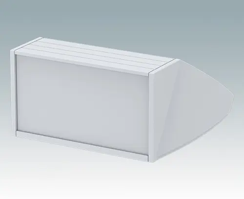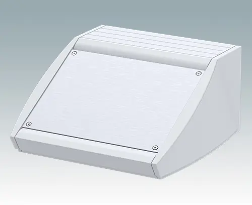 Ergonomic IP 54 rated sloping front enclosure for desktop or wall mounted electronics equipment. Pre-assembled aluminum case body with removable base panel. Front aperture for mounting the accessory front panels. Recessed rear face for mounting switches and power and data connections. To maintain IP 54 rating, fit PCB pillars M5600001, or your own plugs to the mounting holes in the base panel.