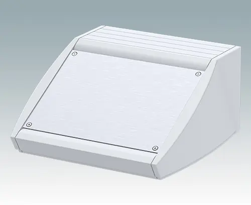 Ergonomic sloping front enclosure for desktop or wall mounted electronics equipment. Pre-assembled aluminum case body with removable base panel. Front aperture for mounting the accessory front panels.  Recessed rear face for mounting switches and power and data connections.