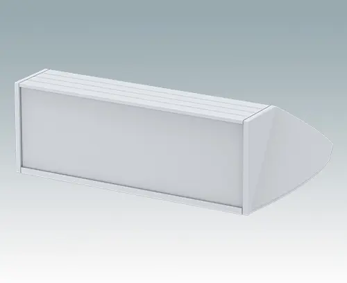 Ergonomic sloping front enclosure for desktop or wall mounted electronics equipment. Pre-assembled aluminum case body with removable base panel. Front aperture for mounting the accessory front panels.  Recessed rear face for mounting switches and power and data connections.
