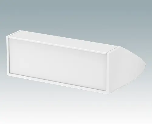 Ergonomic sloping front enclosure for desktop or wall mounted electronics equipment. Pre-assembled aluminum case body with removable base panel. Front aperture for mounting the accessory front panels.  Recessed rear face for mounting switches and power and data connections.