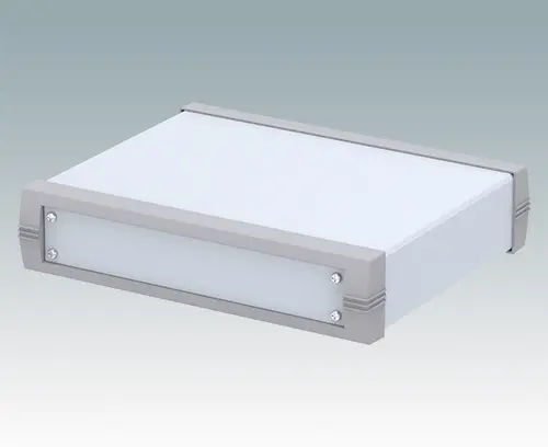 Advanced instrument enclosure for desktop electronics. Stylish front and rear bezels are fitted to the fabricated case body. Pre-assembled internal chassis supplied with four snap-in PCB guides. Two standard guide positions - additional positions can be punched on demand. The case is supplied with a rear panel and four non-slip feet. Order front panels separately.