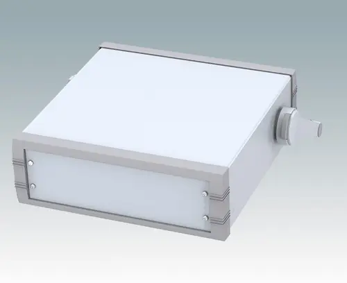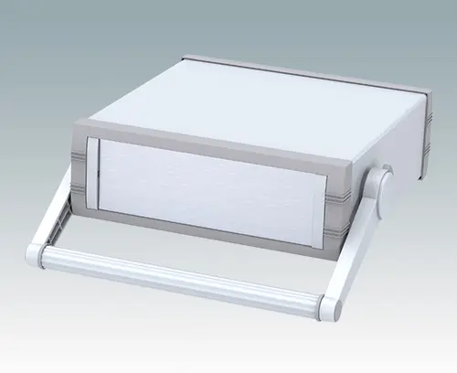 Advanced instrument enclosure with handle/bail arm for desktop and portable electronics. Stylish front and rear bezels are fitted to the fabricated case body. The handle can be indexed at 30° increments.Pre-assembled internal chassis supplied with four snap-in PCB guides. Four standard guide positions - additional positions can be punched on demand. The case is supplied with a rear panel and four non-slip feet. Order front panels separately.