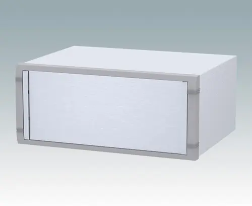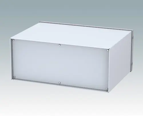 Modern instrument enclosure for desktop electronics. Highly attractive die cast front bezel is fitted to the fabricated case body. The base and rear panels are removable for easy access. Mounting holes in base are designed for fitting the accessory PCB pillars. Order the front panel separately.